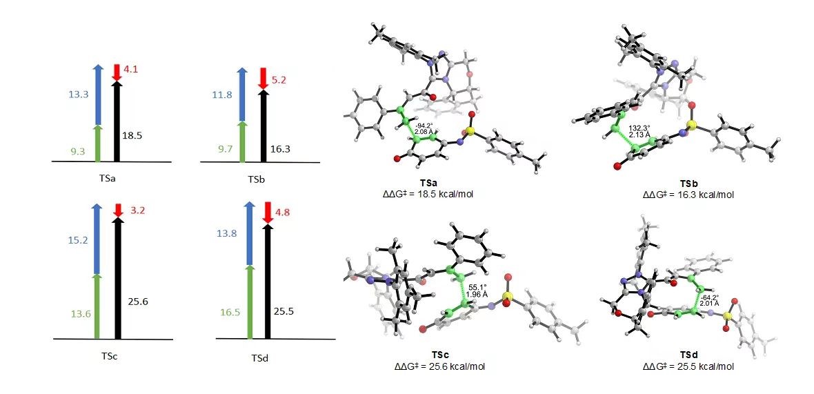 最后,对反应机理研究发现,NHC对底物的醛基化合物的γ-位点进行活化,生成乙烯基烯醇盐中间体。该中间体与亚胺醌进行反应时,存在两个潜在的反应位点(醌的邻位碳和亚胺邻位碳)。为了探究NHC在该反应的位点选择性中所起的作用,作者利用DFT理论进行研究,对四种关键过渡态进行分析,研究表明形变力是导致位点选择差异性的主要原因。(图3)
