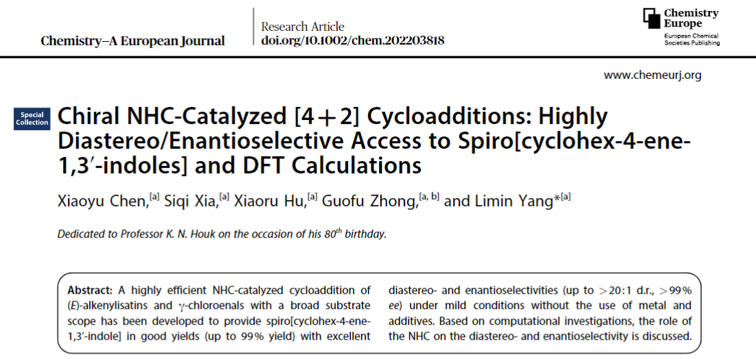 近日,jdb电子-jdb电子游戏 杨丽敏副教授课题组在“Chem. Eur. J.”(IF=5.028)期刊发表学术论文“Chiral NHC-Catalyzed [4+2] Cycloadditions: Highly Diastereo/Enantioselective Access to Spiro[cyclohex-4-ene-1,3’-indoles] and DFT Calculations”.