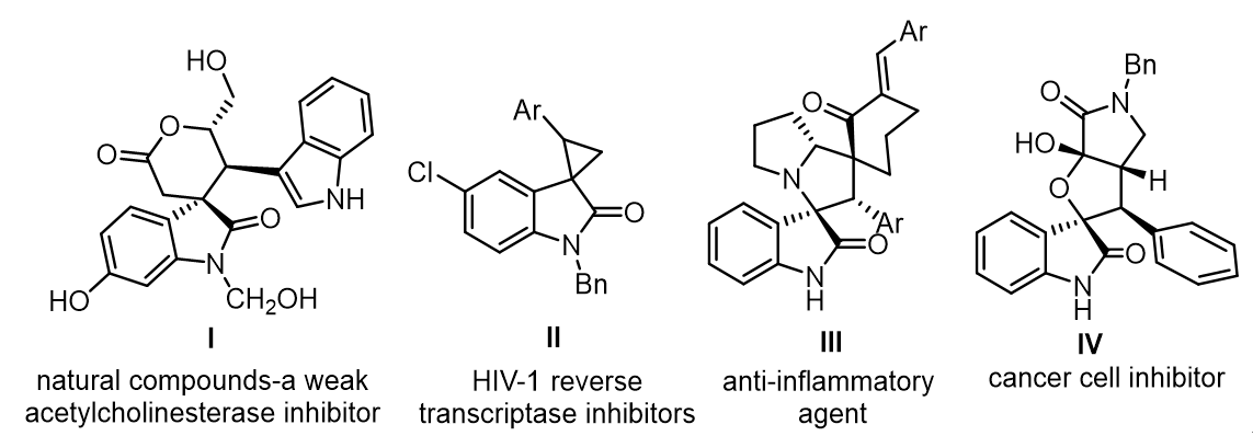 螺环吲哚是许多具有生物活性的天然产物和药物的基本结构骨架。在药理学方面,该类化合物具有抗肿瘤、抗焦虑、抗炎、抗高血压、解热和镇痛等活性。因此,开发更加高效、绿色、高对映选择性的合成方法具有重要的应用价值。