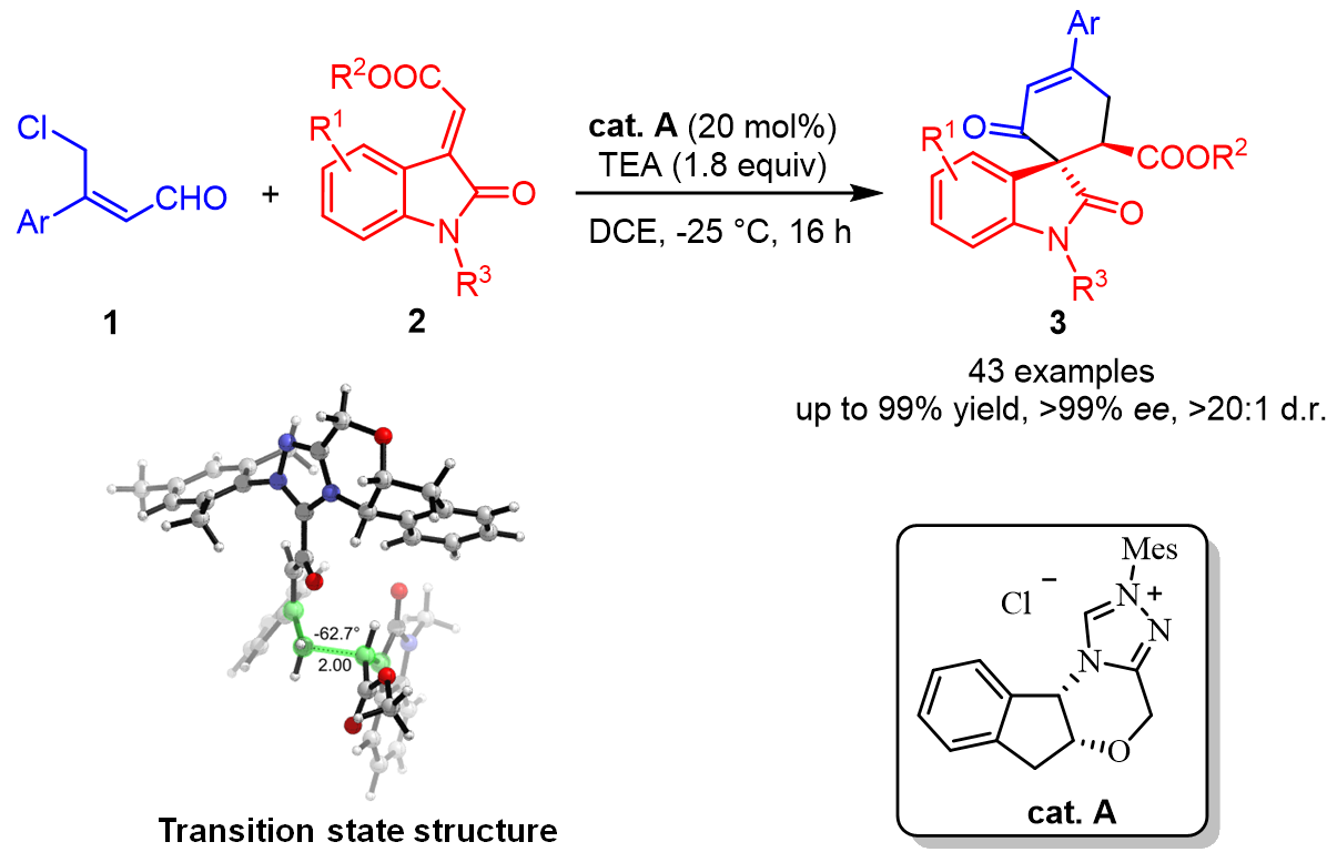 最近,jdb电子 杨丽敏副教授课题组基于课题组先前的研究经验(Org. Lett. 2020, 22, 3329;Org. Lett. 2019, 21, 7943;Chem. Commun., 2018, 54, 1567),与东方理工高等研究院的钟国富教授合作报道了一例手性氮杂环卡宾催化合成手性螺[环己-4-烯-1,3’-吲哚]衍生物的新方法。该催化体系以手性1-氨基-2-茚醇衍生的三氮唑类卡宾为催化剂,以易得的γ-氯代烯醛和靛红衍生的烯酮为底物,顺利合成手性螺[环己-4-烯-1,3’-吲哚]衍生物。反应条件温和,并且无需使用金属和添加剂,官能团耐受性好、收率高、对映选择性好。