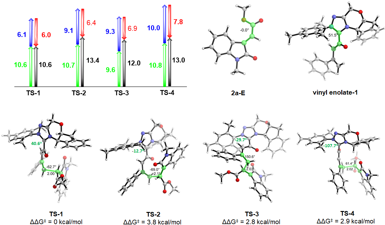 图四. 过渡态TS1-4的形变、相互作用和活化能的优化结构和图(绿色:烯基靛红的形变能,蓝色:vinyl enolate的形变能,红色:相互作用能,黑色:活化能)