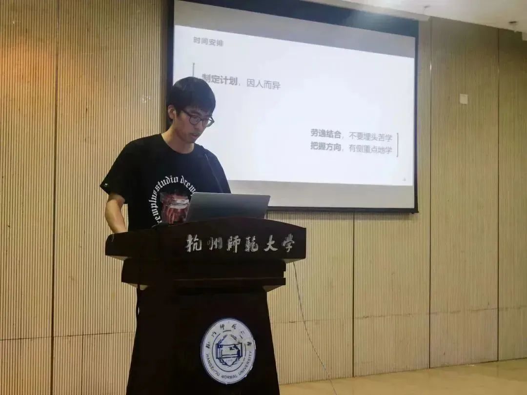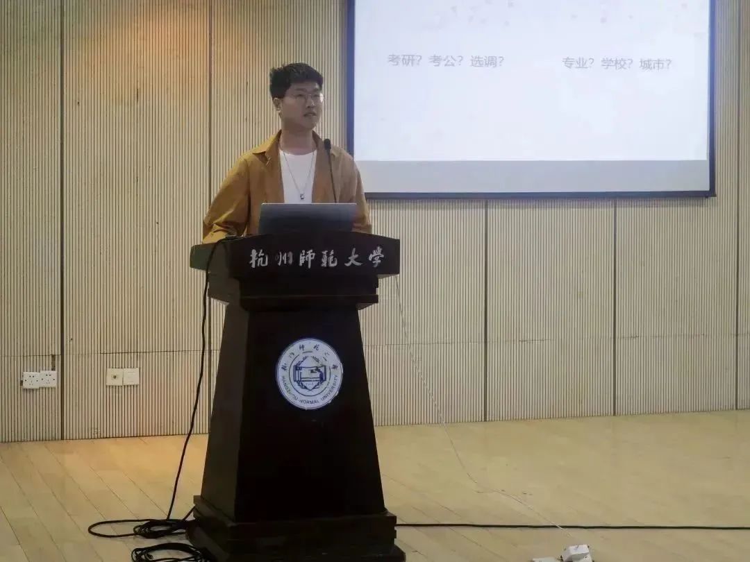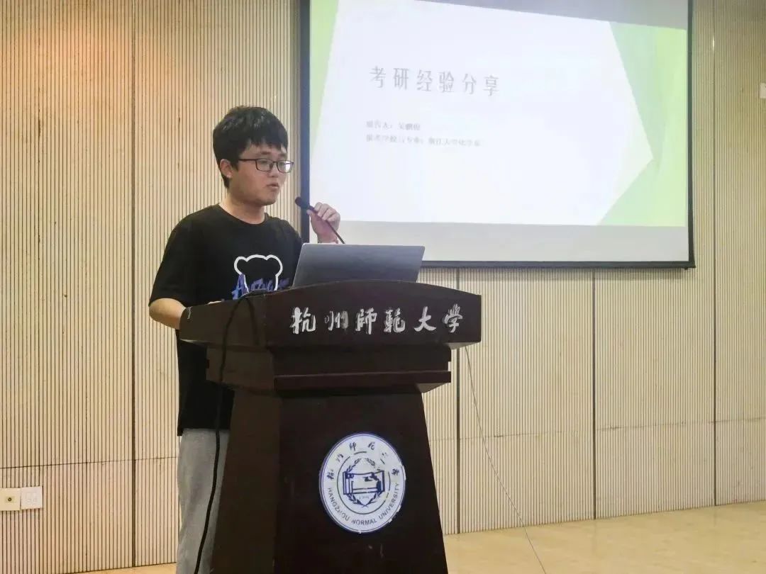 优秀考研学生代表邬宇凯、吴菲菲、金迦南、吴鹏俊四位同学依次上台作考研经验分享,他们向同学们展示了自己对考研各科目的心得体会,从准备工作、备考方式和备考心态等方面向大家提供了宝贵的建议,对备考途中可能存在的问题悉心地逐一解答,现场同学受益匪浅。