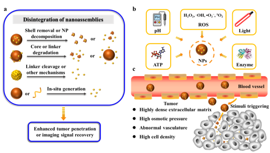图1. 可分解的大尺寸组装体在肿瘤区域高效释放高穿透型小尺寸纳米颗粒。