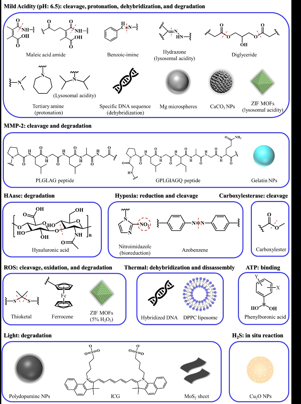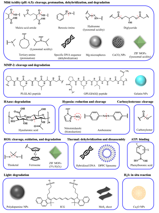 图2. 针对不同刺激所设计的可分解的组装体响应单元。