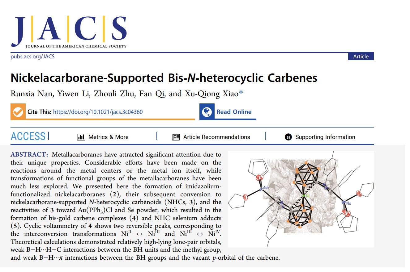 近日,jdb电子 效旭琼教授课题组在碳硼烷与氮杂环卡宾化学方面取得新进展,相关研究以“Nickelacarborane-Supported Bis-N-heterocyclic Carbenes”题为在化学领域顶级期刊《美国化学会志》(Journal of the American Chemical Society, JACS,IF:15.0)上发表。