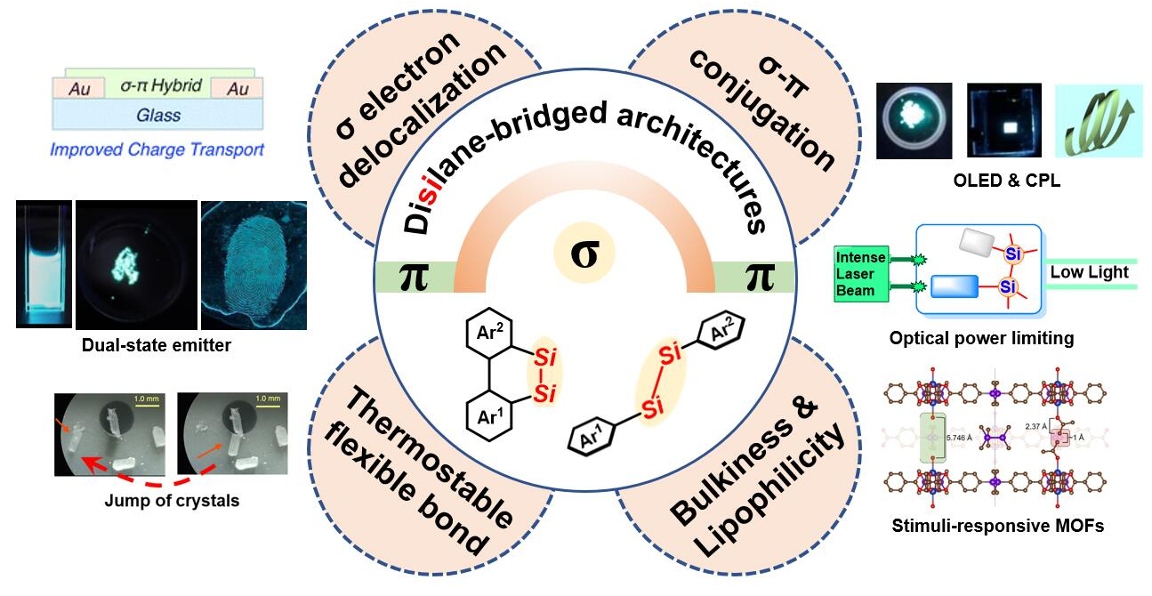 在众多有机硅化合物中,Si-Si键与单硅烷、Si-O-Si等传统有机硅结构单元的性质迥异。Si-Si键的典型特性是σ-电子离域,Si-Si σ键具有与C=C双键相当的HOMO能级,可以与大多数诸如苯环、芳香杂环、多环芳烃等π体系分子产生共轭,即σ-π共轭效应。这些特性使Si-Si键在空间结构上类似C-C单键,但电子结构却更像C=C双键,且Si-Si键有较高的热稳定性和柔性。Si-Si键骨架分子材料在分子导线、电致发光、非线性光学和刺激响应型智能材料等领域具有广泛的潜在应用。将Si-Si键作为构筑单元的新骨架设计具有重要的基础研究意义,可以带来许多结构上的变革和应用的创新。