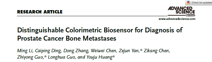 近日,jdb电子 黄又举教授团队与宁波大学附属第一医院合作开发用于诊断前列腺癌骨转移的可视化比色生物传感器方面取得新进展。相关研究结果以“Distinguishable Colorimetric Biosensor for Diagnosis of Prostate Cancer Bone Metastases”为题在Advanced Science (Q1, IF=15.1)期刊接收。DOI: 10.1002/advs.202303159。