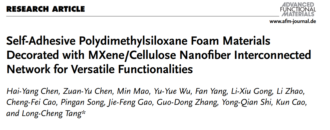 近日,我校jdb电子 汤龙程教授团队基于有机硅分子交联/发泡反应机制,提出一种自粘型硅橡胶泡沫材料的设计思路,并制备出高性能PDMS泡沫纳米复合材料。该材料具有轻质弹性、绿色阻燃、可调节导电、以及优异的耐高低温和耐水性等特性,在复杂环境智能医疗监测和防火隔热等方面具有良好的银应用前景。相关研究成果以题为“Self-Adhesive Polydimethylsiloxane Foam Materials Decorated with MXene/Cellulose Nanofiber Interconnected Network for Versatile Functionalities”发表于国际材料领域权威期刊Advanced Functional Materials (2023,IF=19)上。