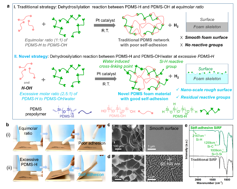 鉴于此,汤龙程教授团队通过简单调整硅橡胶泡沫制备原料中含氢硅油和其他原料的比例,成功制备了一种蠕虫状粗糙表面和反应基团的自粘硅橡胶泡沫基体。该基体对皮肤、塑料、金属和玻璃等多种材料具有良好的物理粘接性。通过浸涂和硅烷改性的协同策略,在自粘性硅泡沫表面构建了稳定的功能涂层。首先,将硅泡沫基体浸入MXene/CNF悬浮液中,基体表面的硅氢基团与MXene/CNF材料的羟基反应,从而实现基体与涂层之间的强化学键结合。然后,通过进一步用含氟硅烷修饰表面,制备了具有多功能的硅橡胶泡沫复合材料。该材料有望应用于智能医疗监测和防火隔热等多种应用。