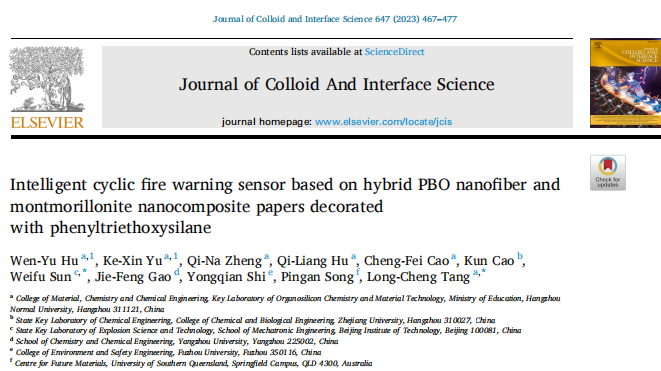 近日,我校jdb电子 汤龙程教授团队设计研发的一种纳米复合材料在循环阻燃智能预警等方面取得新进展,相关研究成果以题为“Intelligent cyclic fire warning sensor based on hybrid PBO nanofiber and montmorillonite nanocomposite papers decorated with phenyltriethoxysilane”发表于国际知名期刊Journal of Colloid and Interface Science(IF=9.965)上。