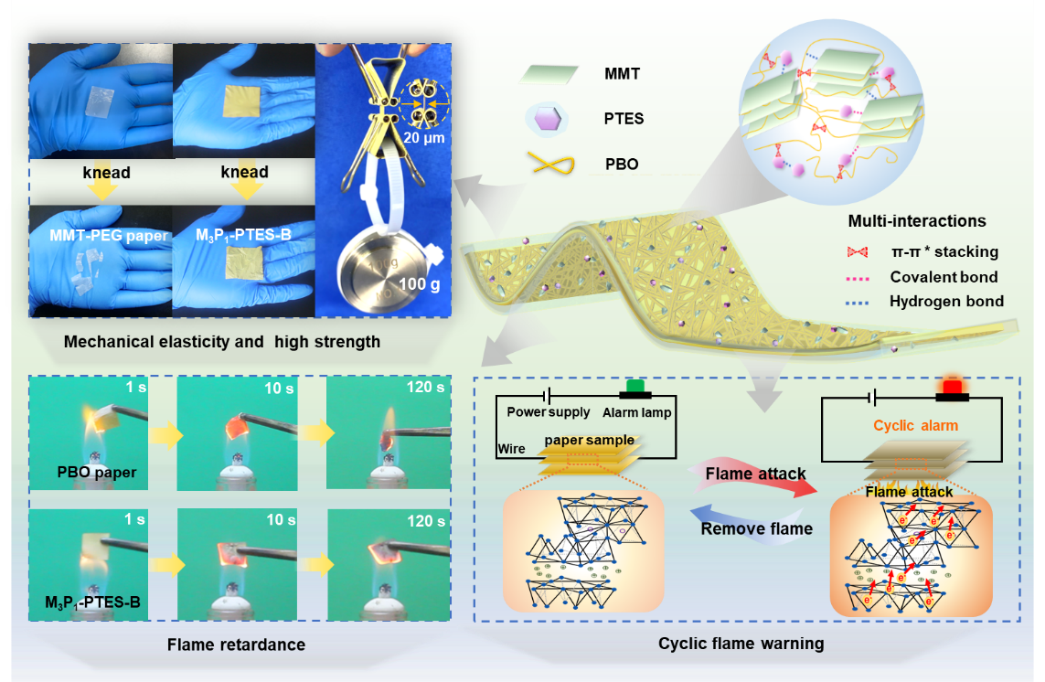 基于此,汤龙程教授团队报道了一种独特的蒙脱石(MMT)基智能火灾预警材料,通过溶胶-凝胶工艺和低温自组装方法,将苯基三乙氧基硅烷(PTES)分子、聚对苯撑苯并双噁唑纳米纤维(PBONF)和多层MMT复合形成硅烷交联的3D纳米网络系统,设计和制备了PTES修饰的MMT-PBONF纳米复合材料。该材料具有稳定的火灾循环预警性能和优异的阻燃性能。