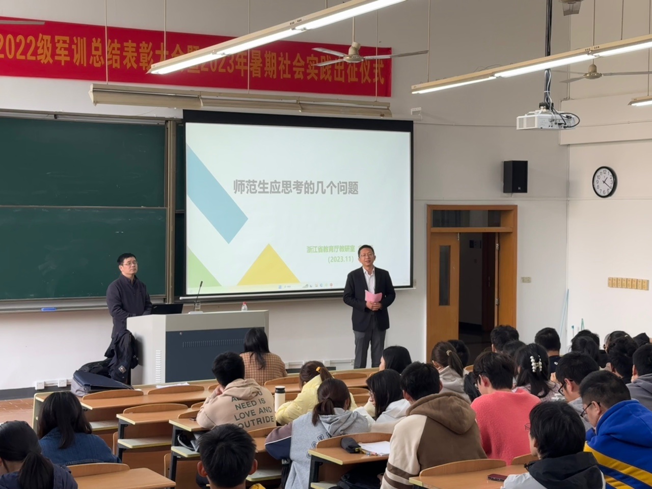 俞建锋从“为什么选择读师范,选择要当一名教师;立志将来想成为一名怎样的教师;为实现这一目标,在大学里要做好哪些准备”三个角度开展讲座。他首先通过向同学们阐释陶行知的三大教育主张“生活即教育、社会即学校、教学合一”,解释了教学的意义以及为什么学校为大学生开展本专题讲座。