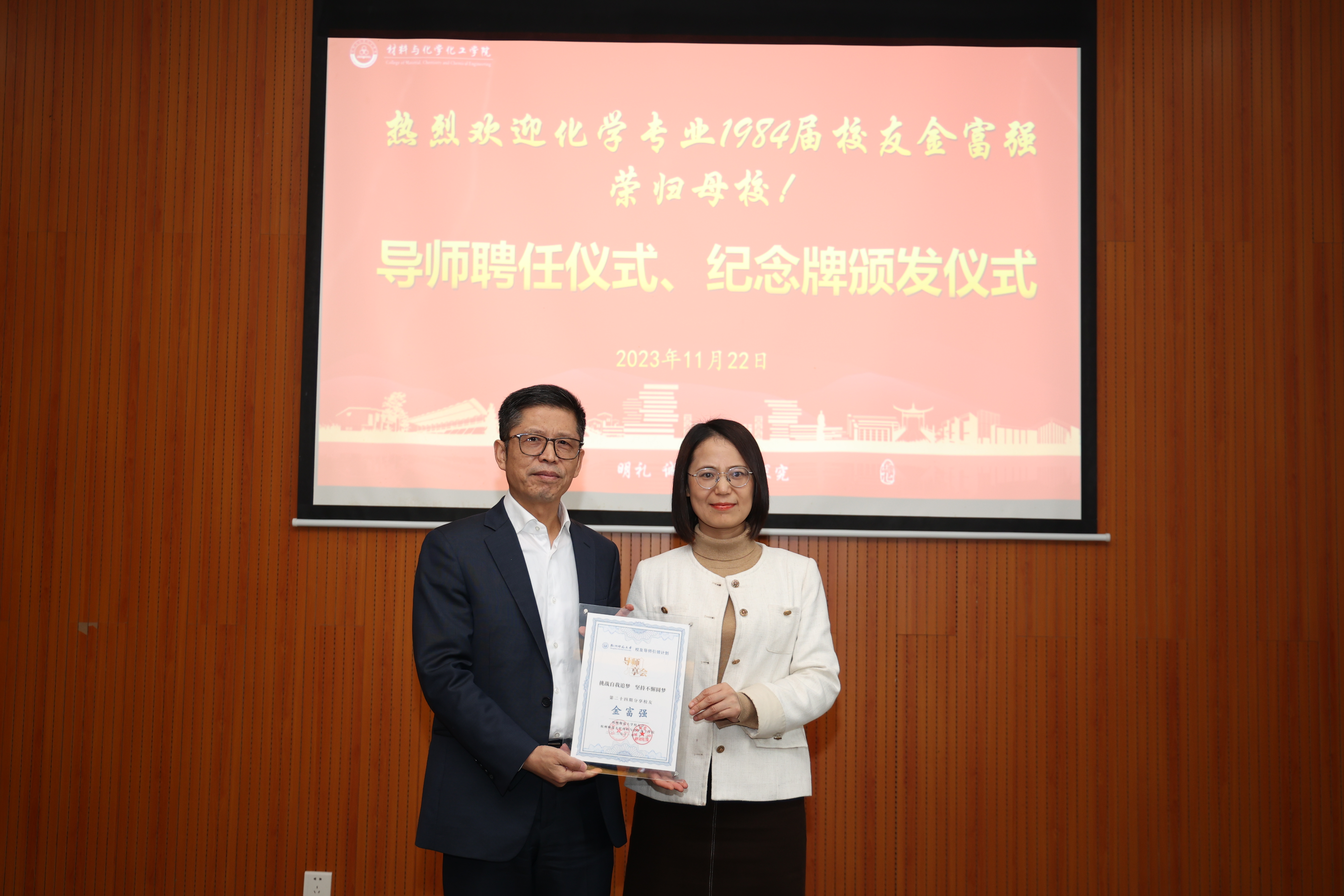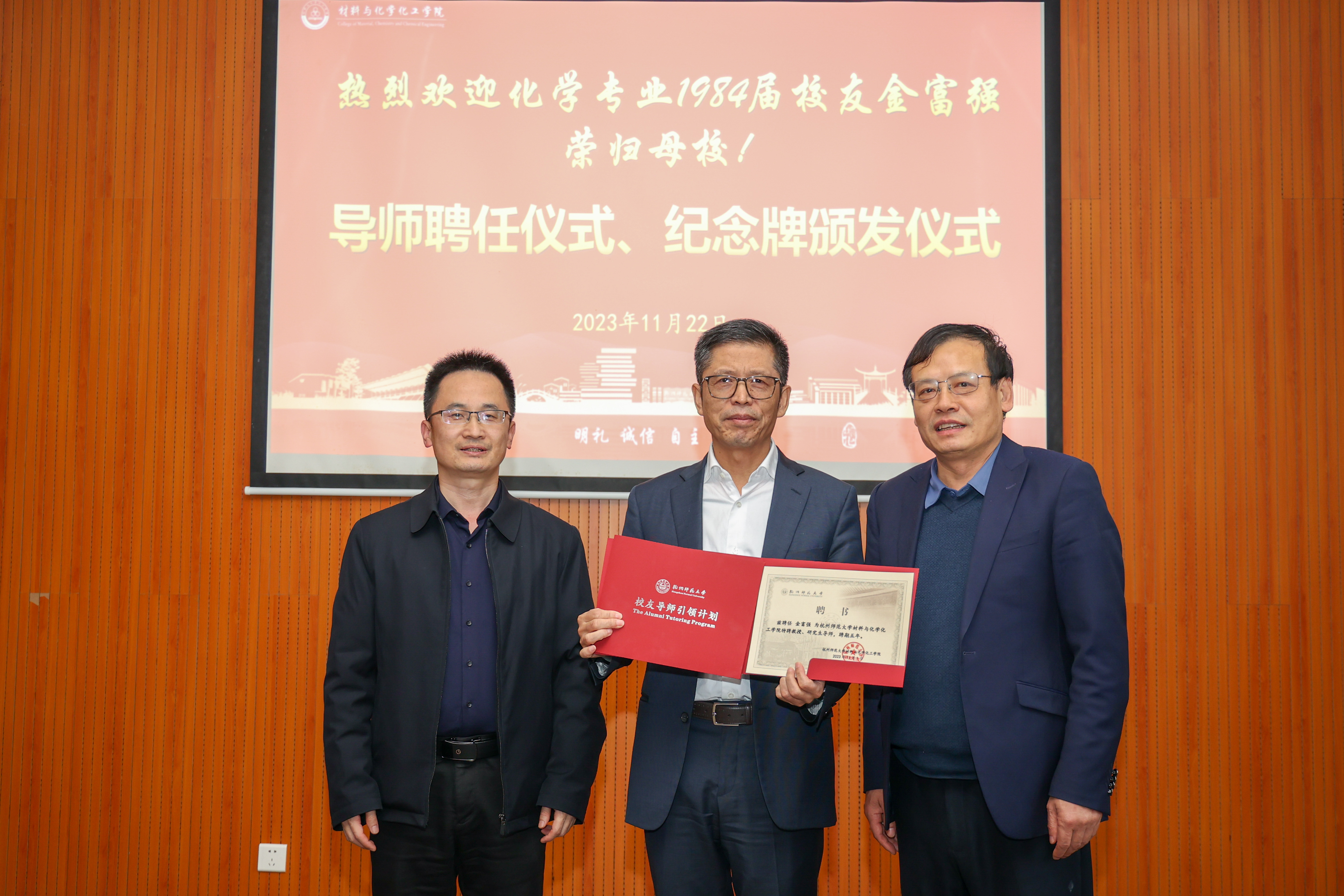 分享会伊始,现场举行了导师聘任仪式和纪念牌颁发仪式,章鹏飞、江齐里分别为金富强颁发“学院特聘教授、研究生导师”聘书和“jdb电子 校友导师引领计划”暨“jdb电子 学生领导力素养提升计划”导师聘书,薛少聪为金富强颁发导师思享会纪念牌。