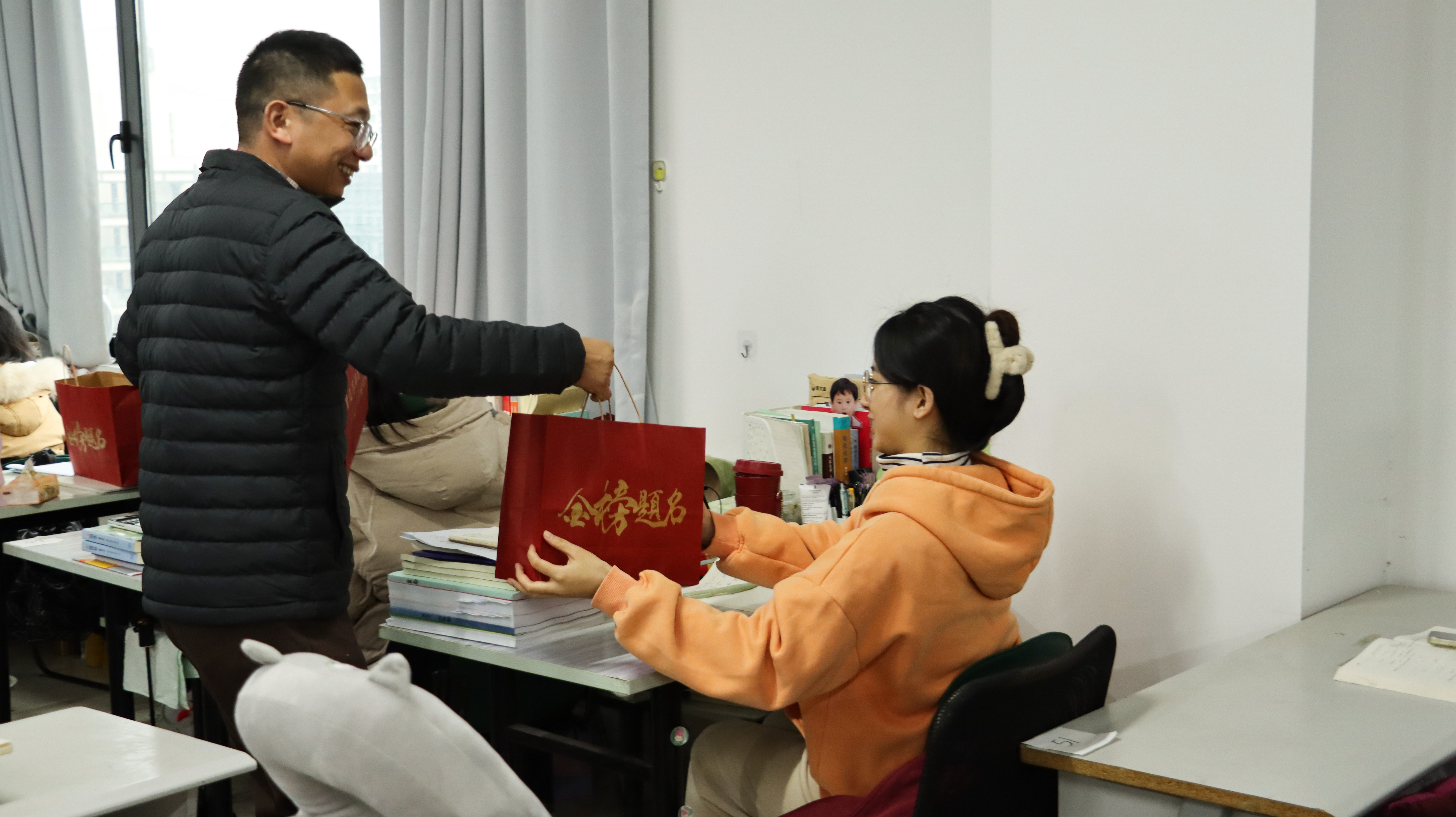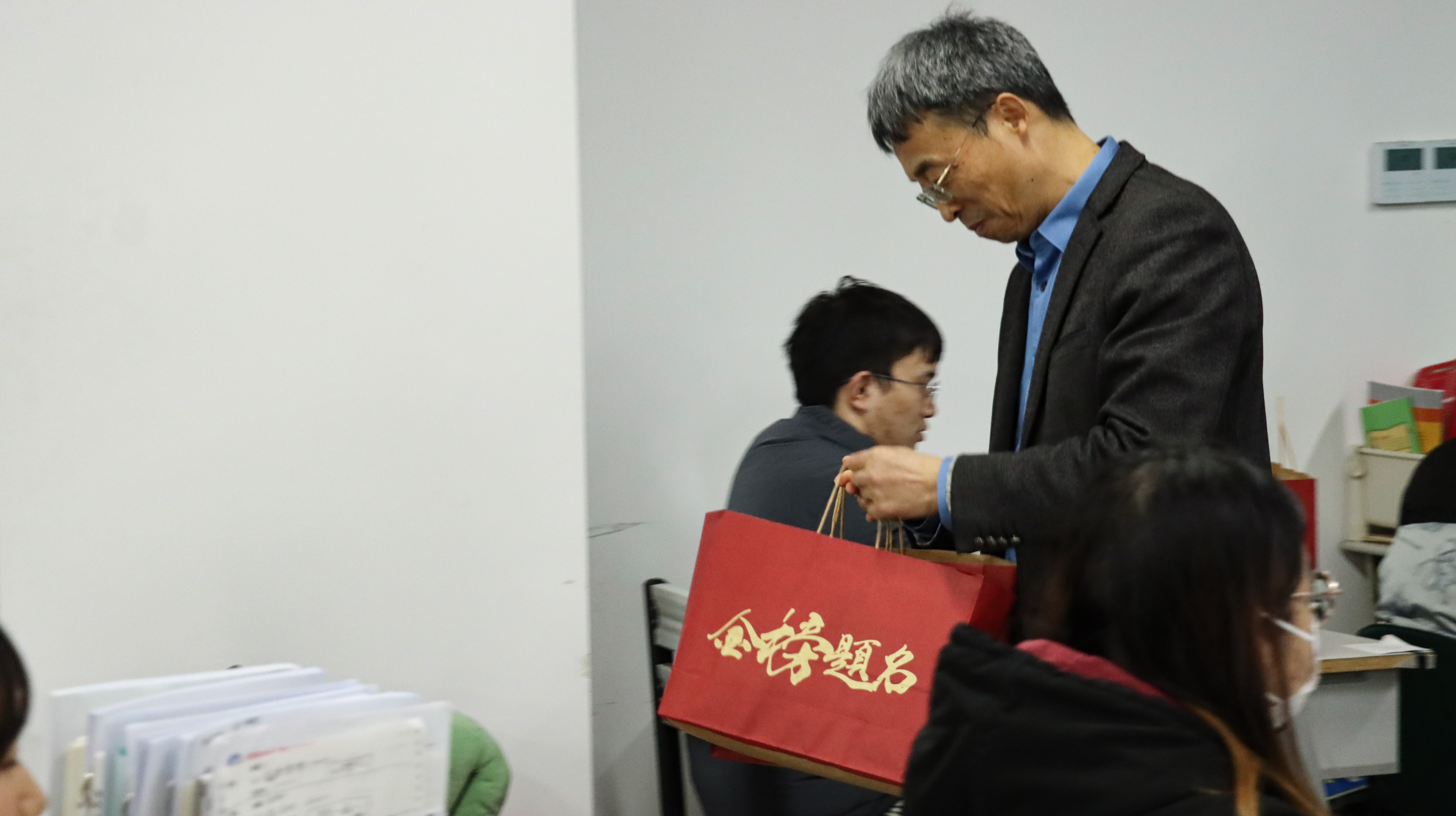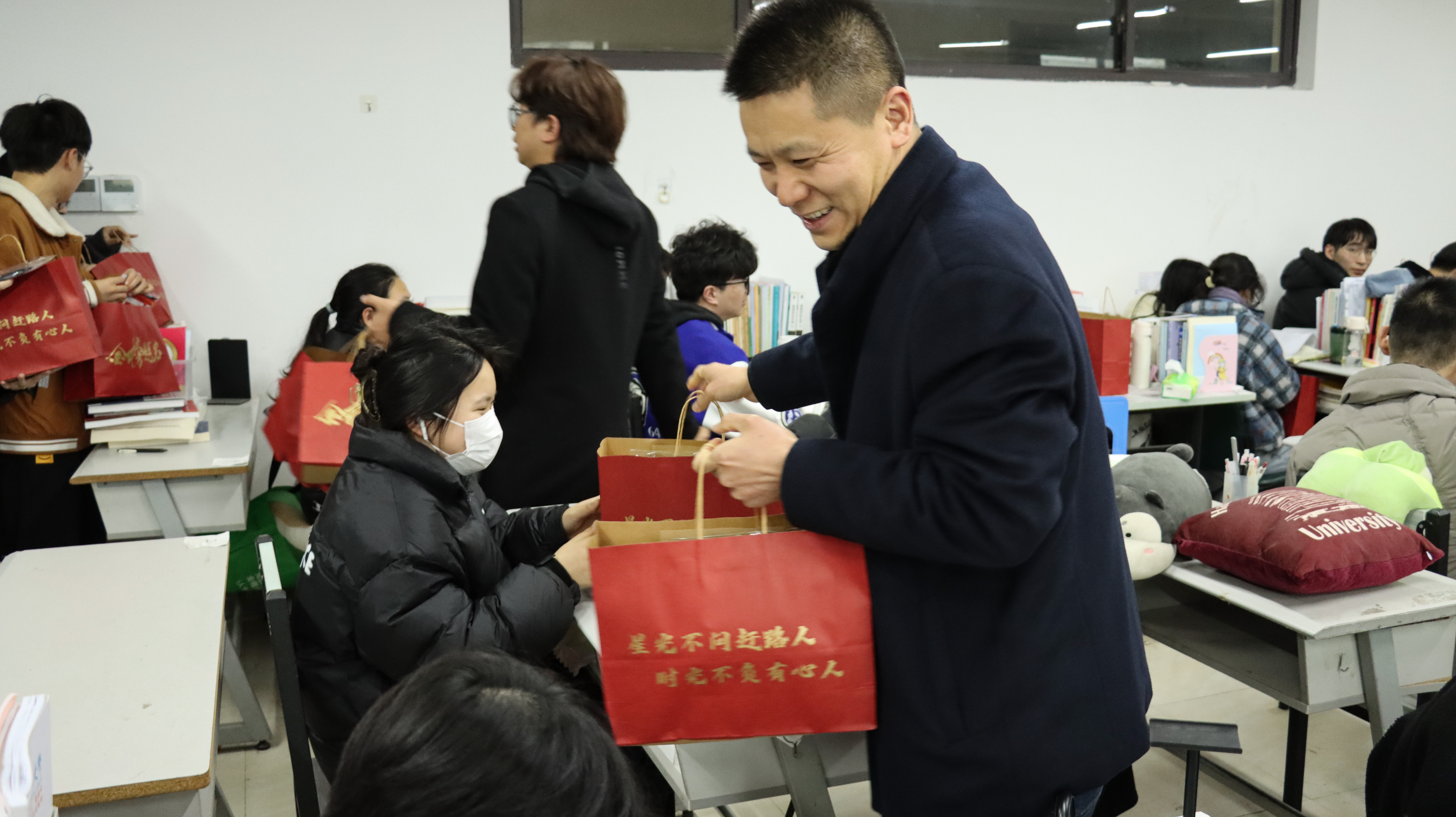 慰问现场,各位老师还与同学们交谈备考体会,传授考试经验,送上“金榜题名”暖心礼包。礼包中的每一个物品都经过了认真筛选与精心设计,不仅有寓意满满的“‘研’气十足”文具袋和“旺气满满”旺仔牛奶,还印有师长们的亲切寄语“星光不问赶路人,时光不负有心人”。小小的物品饱含了学院对考研学子们浓浓关爱和真切祝福,希望考研学子平安如意,发挥出最佳水平!