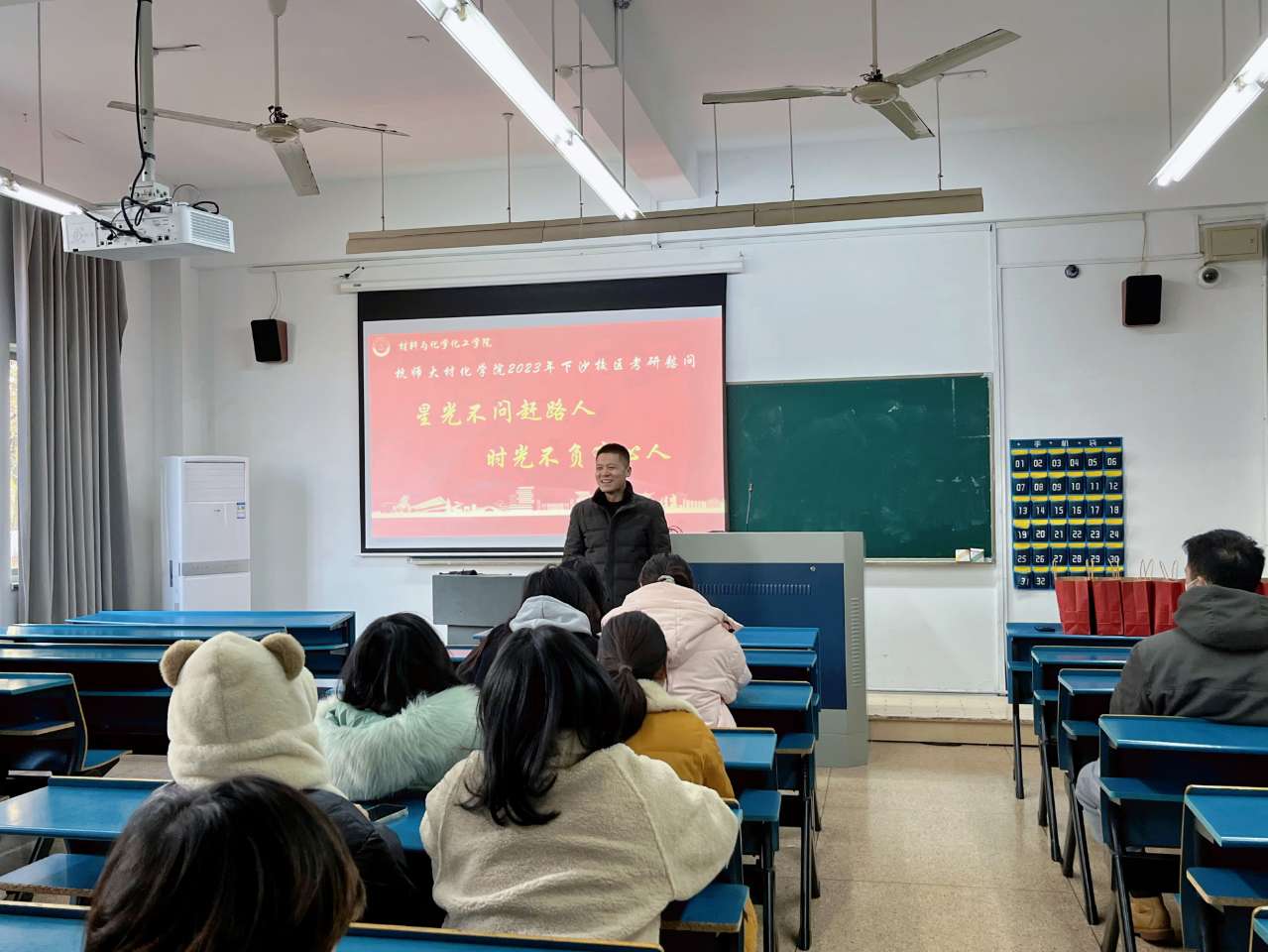 章鹏飞代表学院向考研学子表达了诚挚的关怀和慰问之情,鼓励考生们在最后的时间里,做好“路在脚下,心系远方”的准备,他和同学们一起回顾了前三届毕业生的升学情况,并表示,年年居高的升学率,是材化人努力奋斗的体现,峥嵘过去已经彪炳史册,璀璨当下正在不断延伸,光明未来需要踏实开拓。章鹏飞肯定了考生们在备考路上坚韧不拔的优良品质,提醒同学们在冲刺阶段要注意身体健康,劳逸结合,保持良好的心态,学院永远会是大家最坚强的后盾。