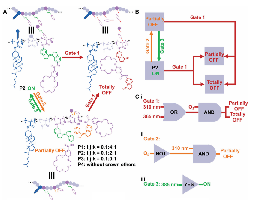 针对以上问题,jdb电子 刘俊秋教授团队联合西北工业大学闫毅教授团队首次提出光控逻辑门离子通道的概念,并将该人工钾通道用于抗癌治疗。作者将分子马达概念与人工离子通道概念结合起来,构建了一种基于分子马达的单链无规共聚合物(RHPs)的光控逻辑门控K+通道,该通道具有类似多核处理器的特性,可逐步控制离子传输。以氧气、脱氧和不同波长的光作为输入信号进行设计,建立了由 "YES"、"AND"、"OR "和 "NOT "门元件组成的复杂逻辑电路。执行这些逻辑电路用K+的传输状态作为输出信号,作者在脂质体和癌细胞中均实现了多种传输状态的转换,包括 "开启"、"部分关闭 "和 "完全关闭",从而进一步实现了分步抗癌治疗。在 "ON "状态下,急剧的K+外流(7 分钟内减少 50%)可显著诱导癌细胞凋亡。作者期待这种集成的逻辑门控策略能在理解NCPs的微妙机制和治疗癌症或其他疾病方面得到推广。