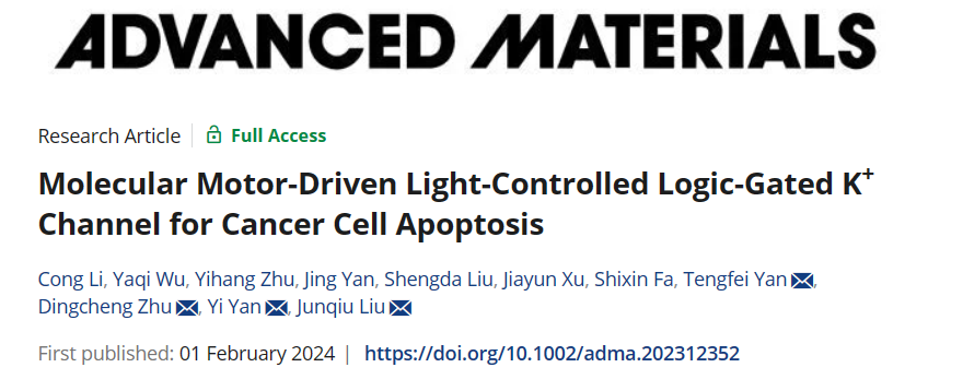 近日,jdb电子 刘俊秋教授团队在光控逻辑门离子通道领域取得新进展,相关研究成果以题为“Molecular Motor-Driven Light-Controlled Logic-Gated K+ Channel for Cancer Cell Apoptosis”发表于国际知名期刊Advanced Materials(IF=29.4)上。