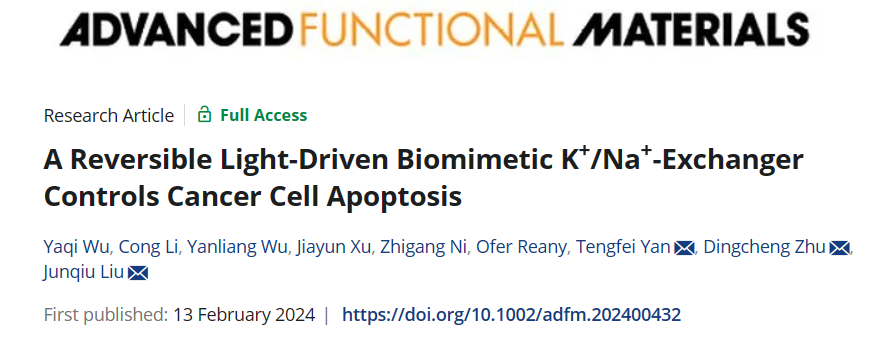 近日,jdb电子 刘俊秋教授团队在光控仿生K+/Na+交换器领域取得新进展,相关研究成果以题为“A Reversible Light-Driven Biomimetic K+/Na+-Exchanger Controls Cancer Cell Apoptosis”发表于国际知名期刊Advanced Functional Materials(IF=19.0)上。