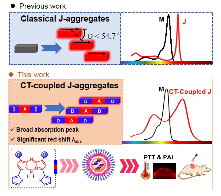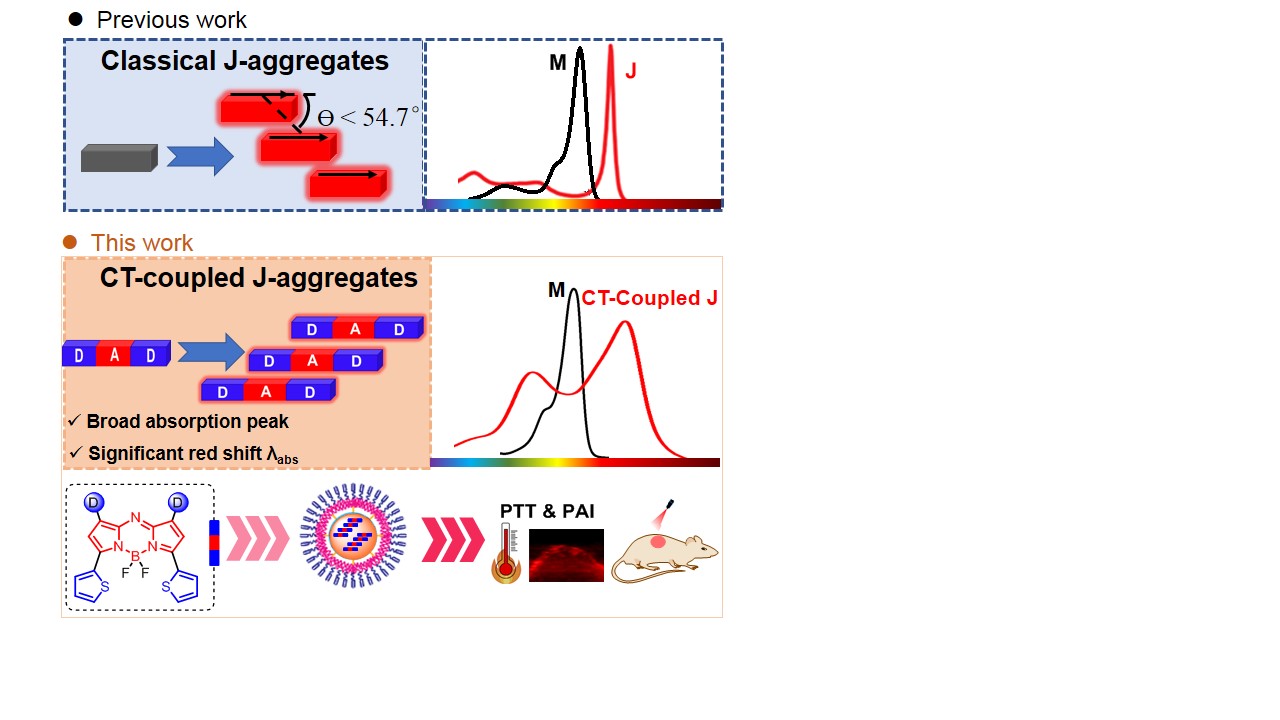 在近红外光诊断和纳米医学领域,近红外有机染料展现出了巨大的应用前景。J-聚集体作为一种构建近红外分子材料的超分子工程策略,通过分子沿偶极矩方向以滑移堆叠的方式积累,在长程库仑耦合的影响下,导致J-聚集体的吸收峰显著红移和谱带变窄,这些特性使得J-聚集成为构建高性能近红外分子材料的有力工具。然而,窄谱带吸收峰导致激光器波长和吸收峰之间的不完全匹配,降低光捕获能力,使得选择合适的激光器进行光疗变得困难。更为重要的是,目前缺乏通用的策略来构建J-聚集体平台,其设计仍然是一个重要挑战。