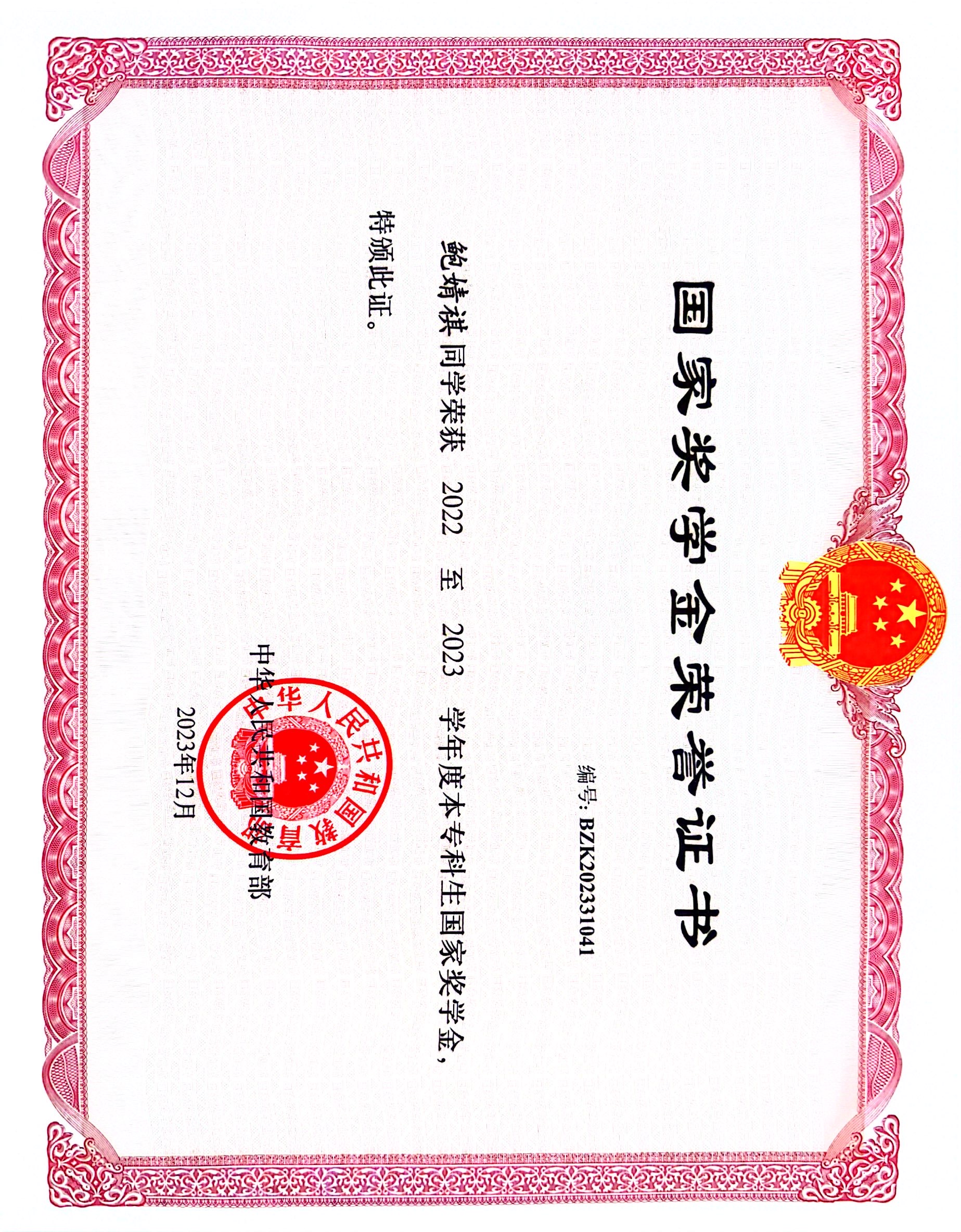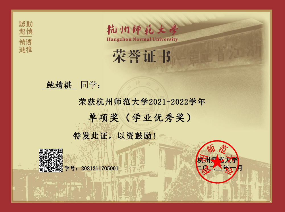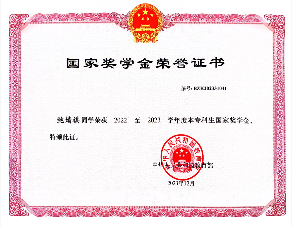三年来,鲍婧祺同学孜孜以求,精益求精,单学期最高绩点达4.51,2023年综测排名第二,27门满绩,45门课成绩90分以上,获得了国家奖学金,一等奖学金,校三好学生等荣誉。