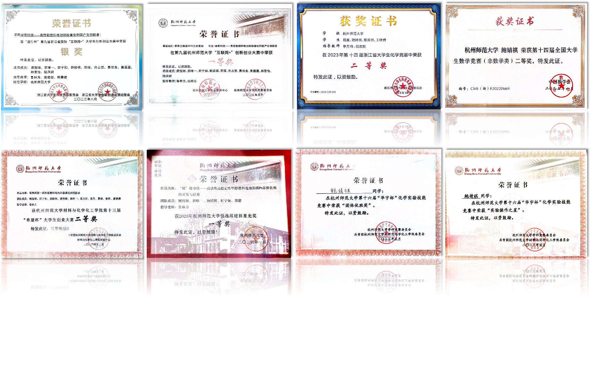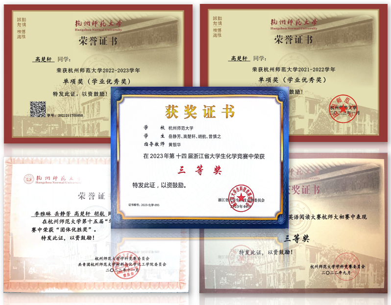 在大一专业课上,鲍婧祺同学对燃料电池催化剂产生了浓厚的兴趣,随后主动联系学院研究催化剂方向的鲁老师,成为一名科研助理,累计实验时长超2000小时,制作催化剂样本819份,经过不懈努力,成功发表三篇SCI论文,负责省级、校级课题3项,申请2项发明专利,同时,她积极参与各类竞赛,获得浙江省第九届互联网+银奖、浙江省化学竞赛二等奖、希望杯二等奖、精进杯一等奖等省级校级奖项。