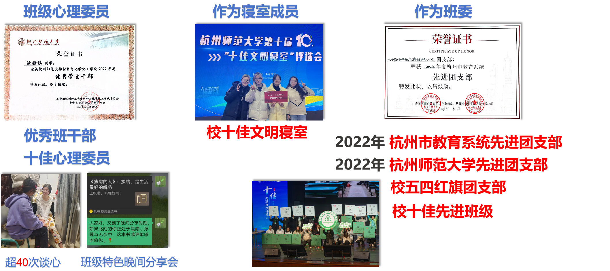 同时,作为班级心理委员,她关注班级同学心理健康,谈心超40次,获评“优秀班干部”、“十佳心理委员”等称号,并与寝室成员共同努力,获评校“十佳文明寝室”称号。