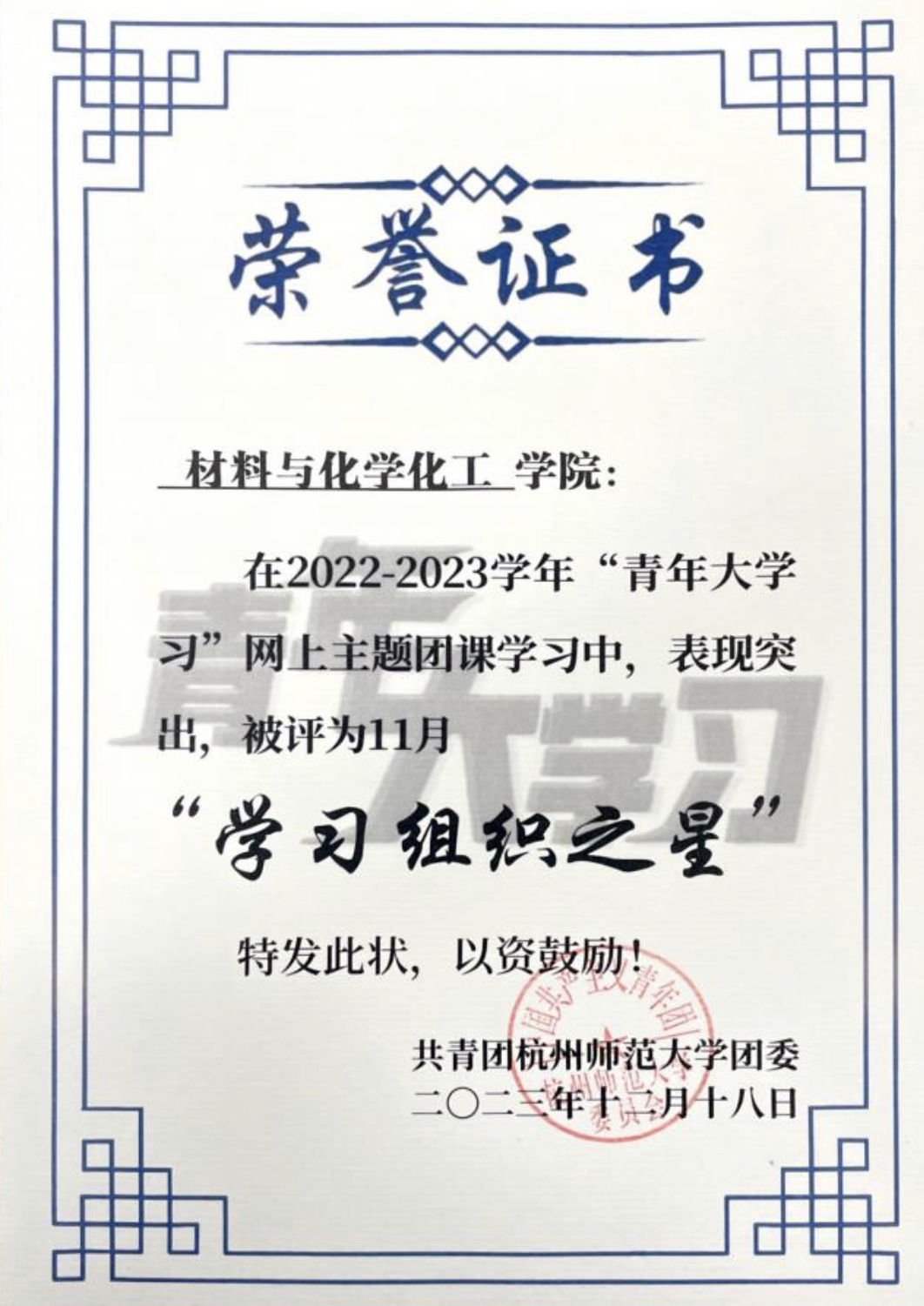 作为化学(师范)211团支部的班委,鲍婧祺同学和高楚轩同学与支部成员共同探索奋进,带领团支部获评杭州市教育系统先进团支部、校“五四红旗团支部”、校十佳文明班级等荣誉称号,支部成员也将继续携手共进,共创未来!