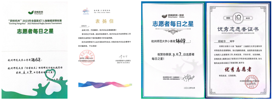 2023年,我校承办浙江省“挑战杯”期间,他在四月初便以骨干志愿者的身份投入到了辛苦繁琐的文本审查工作当中,服务时长超100小时;在复赛与决赛的现场,他又以核心志愿者领队的身份负责赛事的运行和答辩现场的管理,获优秀志愿者称号。