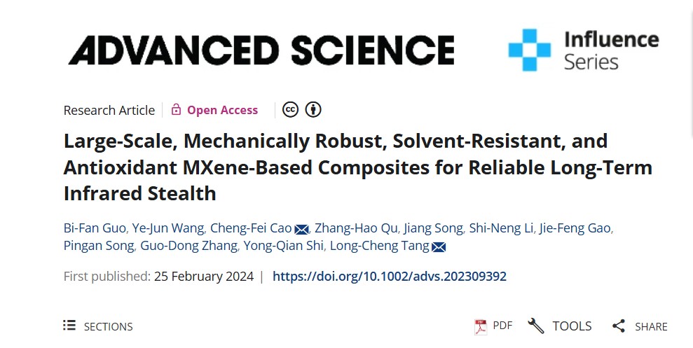 近日,jdb电子 汤龙程教授团队通过结合超支化聚硅氧烷(HSi)与类纤维素的透明质酸(HA),设计了一种可规模化制备且能满足长期红外隐身要求的柔性MXene基红外隐身复合材料,解决了传统MXene基材料在室外复杂环境下耐候性差的难题。相关研究成果以题为“Large-Scale, Mechanically Robust, Solvent-Resistant, and Antioxidant MXene-Based Composites for Reliable Long-Term Infrared Stealth”发表在国际知名期刊Advanced Science (IF=15.1)上。