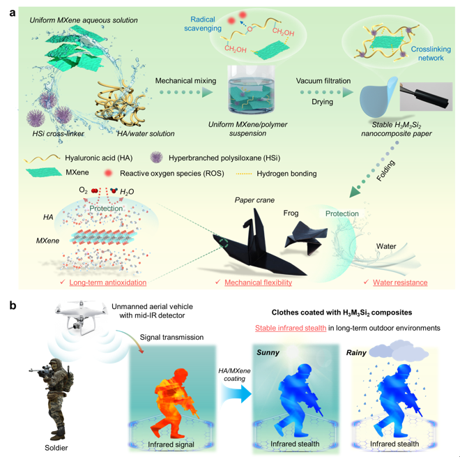 红外隐身材料可以在复杂环境中伪装物体,躲避红外探测器的探测,对生命安全至关重要。MXene是一种用于热伪装领域的“后起之秀”材料,因其较低的中红外发射率,在不同温度(-10~500oC)下均表现出了优异的红外隐身能力。然而,MXene在潮湿环境极易氧化,导致隐身性能会快速衰减;虽然在MXene片上引入改性材料能够抑制了其氧化,但常常不可避免地会削弱红外隐身性能,甚至完全失去热伪装功能。因此,开发兼顾红外隐身和长时环境可靠性的MXene热伪装材料仍是一个挑战。最近,jdb电子 汤龙程教授课题组提出了超支化聚硅氧烷分子(HSi)和透明质酸(HA)协同改性的MXene复合材料,构建出具有共价键和氢键的双重分子网络,能够显著阻隔MXene氧化的同时不会影响其隐身性能,共改性后复合材料显示出优异的力学性能、良好的耐水/耐溶剂性、稳定抗氧化性和可靠的室外环境热伪装能力。