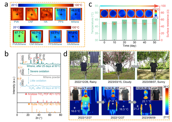 图2 (a)不同高分子/MXene复合膜的红外热成像图;(b)MXene与透明质酸/MXene(H2M2)氧化处理25天后的XRD图;(c)透明质酸/超支化有机硅分子/MXene(H3M3Si2)复合膜浸泡3.5 wt%盐水后的红外热成像图;(d)H3M3Si2涂覆T-恤衫暴露在室外的光学照片和放置室外~8月的前后红外热成像对比图。