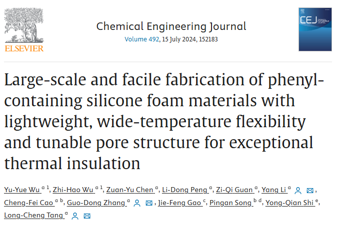 近日,jdb电子 汤龙程教授团队基于有机硅分子交联/反应机制,提出一种轻质隔热、泡孔结构可调硅橡胶泡沫材料的制备新思路,相关研究成果以题为“Large-scale and Facile Fabrication of Phenyl-containing Silicone Foam Materials with Lightweight, Wide-temperature Flexibility and Tunable Pore Structure for Exceptional Thermal Insulation”发表在国际知名期刊Chemical Engineering Journal (IF=15.1)上
