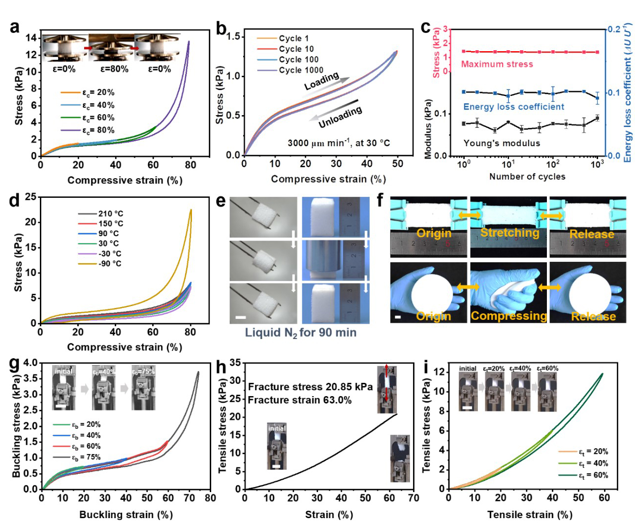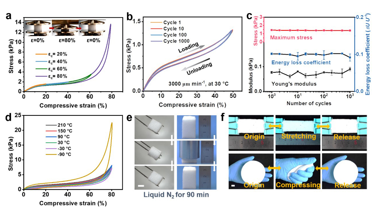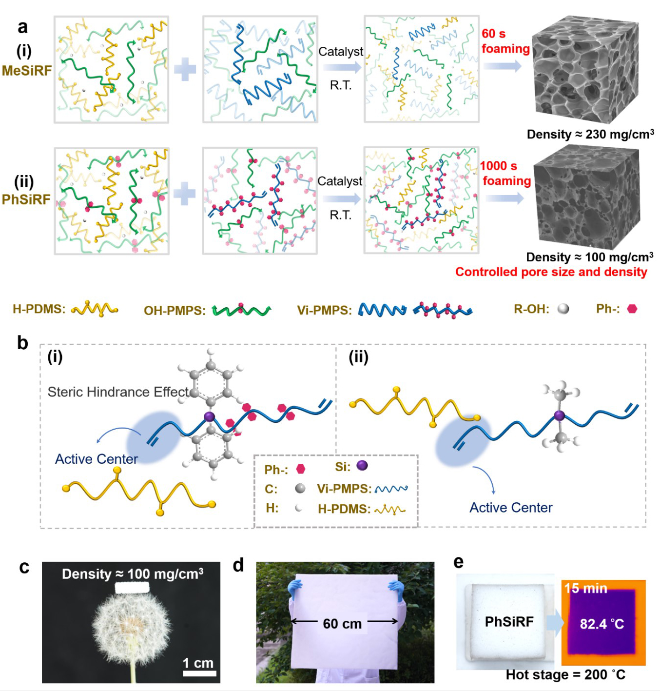 鉴于此,jdb电子 汤龙程教授团队通过在Si-O-Si链上引入苯基空间位阻效应,调整化学发泡过程中交联反应和发泡反应的匹配性,在室温下反应大约15 min后成功制备得到最低密度低至100 mg cm-3的苯基硅橡胶泡沫材料(PhSiRF)。通过调整原材料比例,可以轻松实现对PhSiRF材料的孔隙结构调控,该材料具有优异的循环压缩可靠性,并且在较宽的温度范围内(-90至210 °C)具有良好的机械柔韧性。此外,对PhSiRF材料的隔热性能进行了研究,优化后的样品表现出出色的隔热效果,远优于同等厚度的传统碳基聚合物泡沫材料。