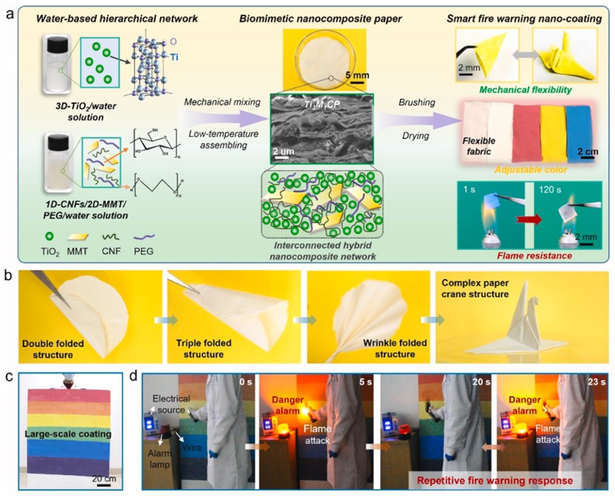 近日,jdb电子 汤龙程教授团队报道了一种绿色、经济高效的大规模制备水基3D-二氧化钛/2D-蒙脱石/1D-纤维素纳米纤维(TiO2/MMT/CNF)纳米复合涂层的策略,通过简单的机械共混法和低温诱导自组装法,提供了一种具有主动火灾预警和被动阻燃防护的绿色纳米复合涂料。在本研究中,TiO2网络可为暴露于火焰后价带(VB)和导带(CB)之间的电阻跃迁提供火灾警报信号,无机MMT填料可以提高网络的阻燃性和结构稳定性,而纤维素和PEG分子的加入可以得到具有良好机械性能的自支撑纸,该TiO2/MMT/CNF交联网络在刚性木材和软质织物基材上表现出可调节的颜色、良好的机械灵活性(折叠成千纸鹤形状)、出色的阻燃性能以及稳定的循环报警性能。