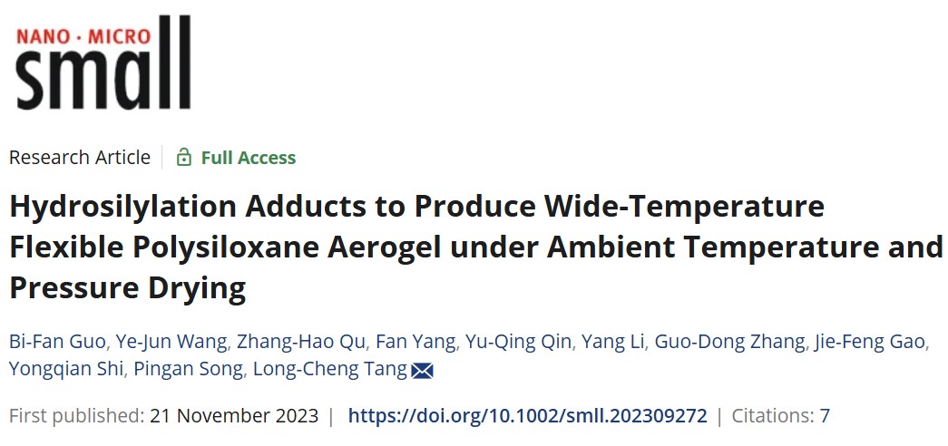 近日,jdb电子 汤龙程教授团队在有机硅气凝胶隔热领域取得新进展,相关研究成果以题“Hydrosilylation Adducts to Produce Wide-Temperature Flexible Polysiloxane Aerogel under Ambient Temperature and Pressure Drying”发表于国际知名期刊Small(IF=13.3)上。