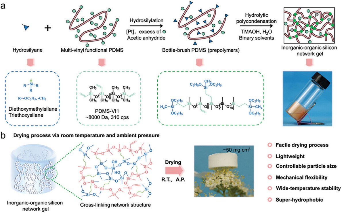 近日,jdb电子 汤龙程教授团队报道了一种新的常温常压干燥柔性气凝胶干燥技术,通过在以Si-O-Si为主链的大分子上引入可溶胶-凝胶的官能团,以改善硅基气凝胶的脆性粉化问题。硅氢加成反应是有机硅化学中最重要的反应之一,通常在催化剂(铂、铑等)作用下选择性地进行硅氢键与含不饱和键化合物的加成反应。在本研究中,通过硅氢加成技术将含氢硅烷(DMST)接枝在端侧基含乙烯基聚硅氧烷(PDMS-VI1)的分子链段上,形成“瓶刷型”聚硅氧烷大分子(bottle-brush PDMS)。该预聚物在碱性条件下将发生烷氧基团的脱水和缩合反应,而形成类果冻状的湿凝胶,经过常温常压干燥可获得极低密度(~50 mg/cm-3)且兼具回弹性的有机硅气凝胶。