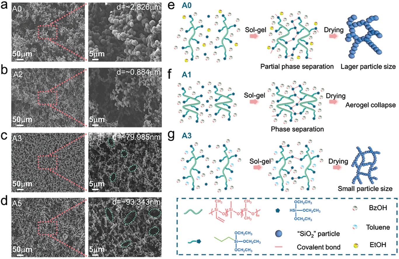 研究中,硅氢加成产物bottle-brushu PDMS具有一定的双亲性(烷氧基:亲水,Si-O-Si主链、甲基以及乙烯基:亲油),导致单一的稀释剂无法实现其凝胶以及后续的干燥,而共混溶剂策略则可有效解决该问题。实验结果表明,通过调控不同溶剂的比例则能实现不同大小的孔径和不同粗细的气凝胶骨架的形成,这直接影响了气凝胶最终的密度。最佳的溶剂配给则能获得性能以及微-纳米孔隙结构最优异的气凝胶。