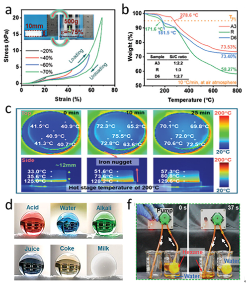 与传统硅基气凝胶相比,该文中所得的气凝胶呈现出较好的回弹性。此外,含有较大的Si/C比,该气凝胶的耐高温性能优于当前文献中报道的柔性有机硅气凝胶,且展示出优异的隔热能力。气凝胶骨架表面的疏水基团以及其本身的微-纳米孔隙结构赋予了该气凝胶超疏水特性,使得其在持续的油水分离过程中表现优异。该体系为开发柔性超低密度气凝胶提供了条新的思路,并为未来的热管理和油水分离领域提供了更高效和可控的方案。
