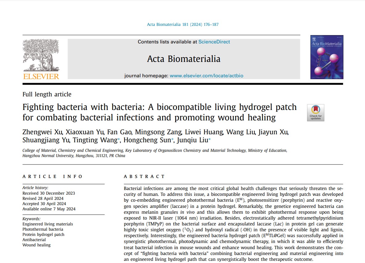 近日,jdb电子 刘俊秋教授团队在活体生物材料用于疾病治疗方面取得新进展。相关研究结果以“Fighting bacteria with bacteria: A biocompatible living hydrogel patch for combating bacterial infections and promoting wound healing”为题发表在Acta Biomaterialia (IF= 9.7)。