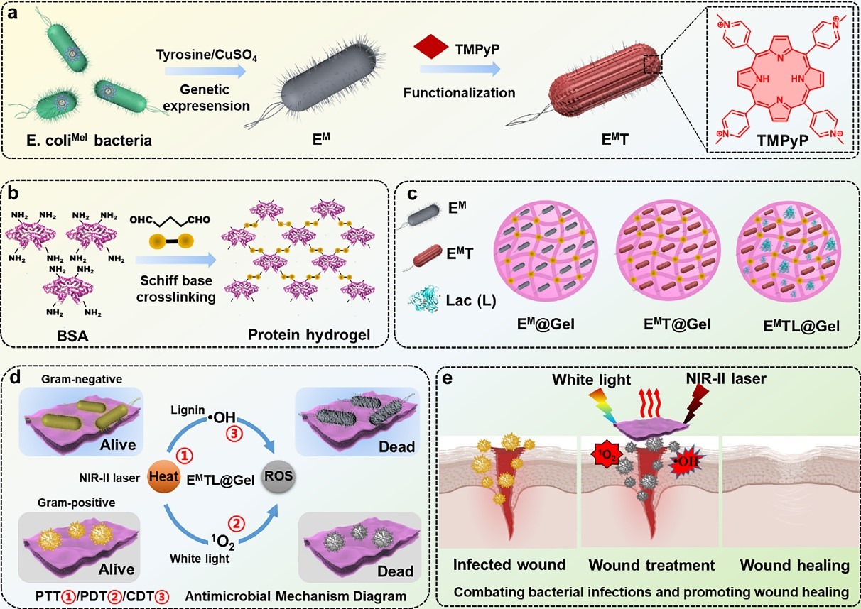 为了促进细菌感染的治疗效果并在时空上限制工程细菌的感染,jdb电子 刘俊秋教授团队提出“以菌抗菌”的概念,将工程光热细菌与蛋白质水凝胶平台相结合,开发了一种生物相容性、多模式、工程活蛋白质水凝胶贴片,用于结合活性氧(ROS)和细菌的光热疗法(图1)。首先构建了一种黑色素基因工程大肠杆菌(EM)并用于体内表达黑色素颗粒,表现出良好的光热响应。带正电荷的四甲基吡啶卟啉(TMPyP)被吸附在EM(EMT)表面,通过避免聚集和提高PDT抗菌剂的量子产率,促进光介导产生剧毒单线态氧(1O2)。漆酶(Lac)是一种含铜多酚氧化酶,被引入以在木质素存在的有氧条件下催化有毒ROS的产生。最后,通过戊二醛交联,将工程化的 EMT 生物杂化物和 Lac 酶 (EMTL@Gel) 共同嵌入生物相容性牛血清白蛋白 (BSA) 水凝胶贴片中。