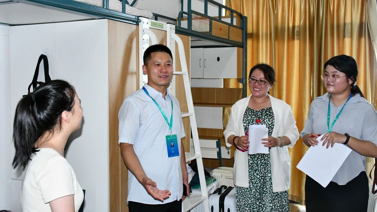 上午, 校党委书记郭东风一行领导莅临现场指导迎新工作,了解新生报到情况,亲切慰问迎新工作人员,对工作人员的辛勤付出表示高度赞扬。