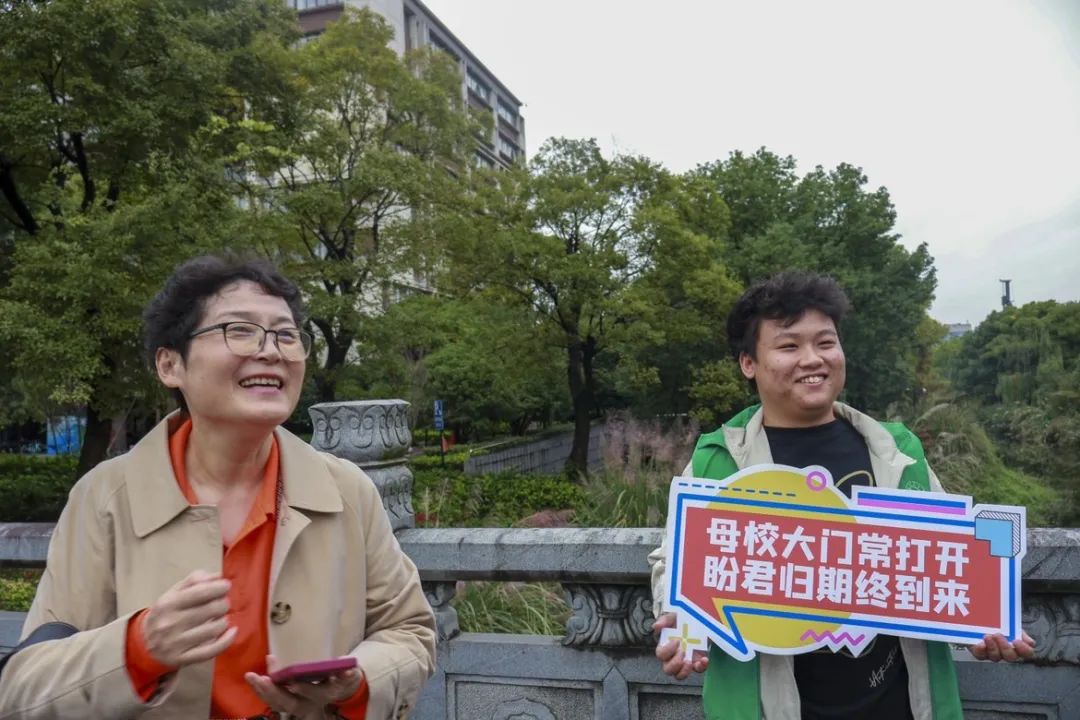 在校名石前,校友们展开浓情横幅,高举暖心标语,记录下美好瞬间。