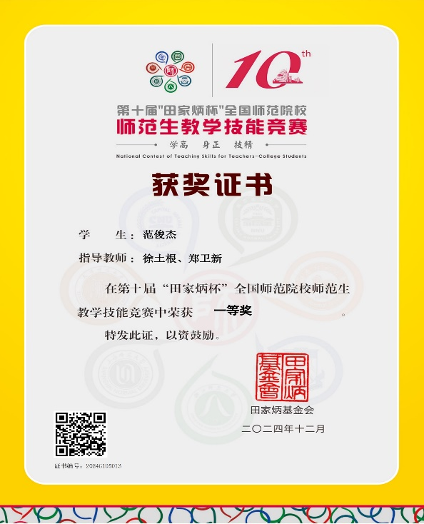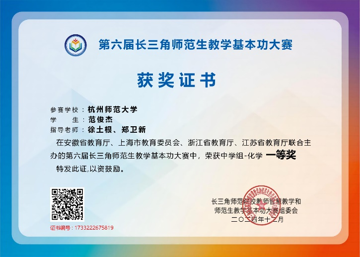 2024年11月15至17日,第六届长三角师范生教学基本功大赛在安徽师范大学举行;2024年11月29日至12月1日,第十届“田家炳杯”全国师范生教学技能大赛在浙江师范大学举行。经过激烈角逐,jdb电子 化学师范211范俊杰分别荣获: