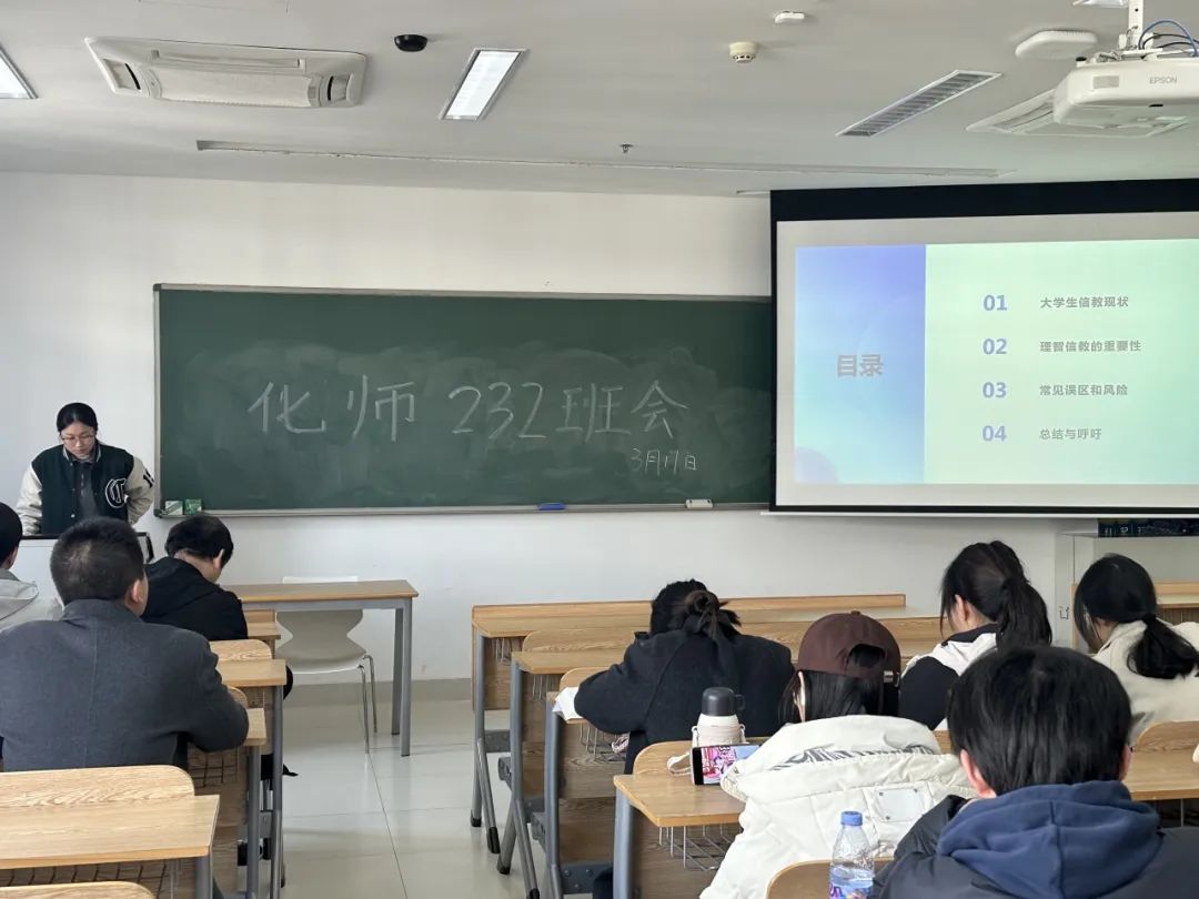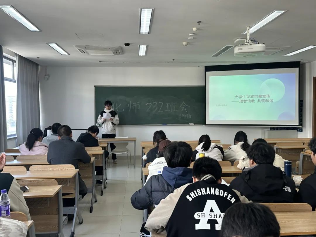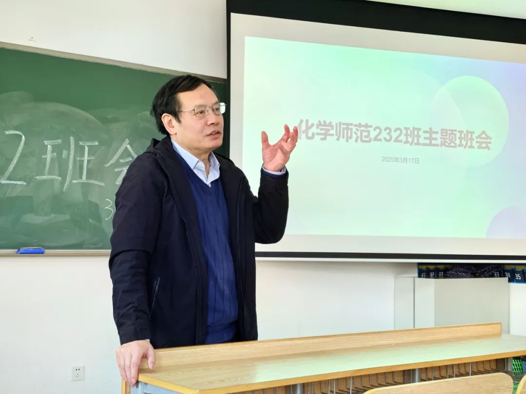 3月17日上午,化学师范232班以“科学生活,共筑和谐”为主题举行了一场别开生面的主题班会,旨在引领大学生如何正确认识马克思主义宗教观,了解党的民宗政策。jdb电子 院长章鹏飞教授作为班级结对领导参加本次主题班会并发表讲话。班主任方显杰教授、学院党委副书记管庆江、辅导员黄海伦参加班会。班会由班长何梓娴主持。