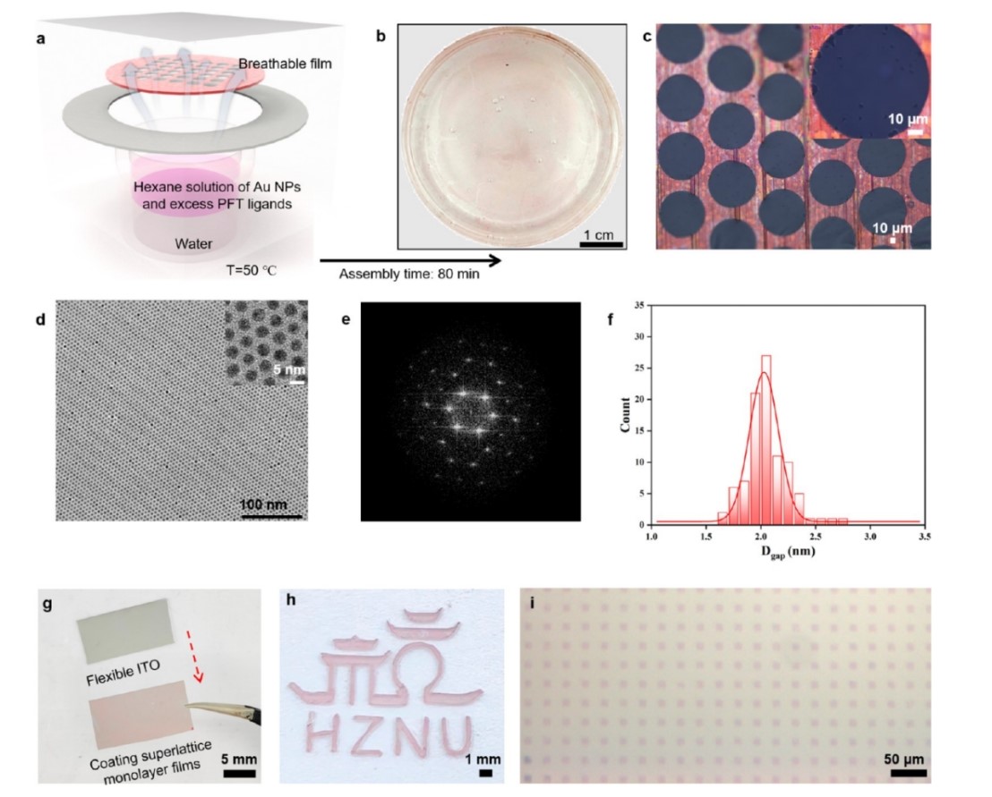 超晶格组装过程如同在微纳世界里建造一座完美的水晶宫殿,不仅需要一块极其平整的“地基”(稳定相界面),还要确保每一块“砖”都能精确地找到自己的位置(纳米粒子朝畴愈合方向降低系统势垒)。2021年,jdb电子-jdb电子游戏 黄又举教授团队提出了一种超疏水力诱导的超快速(5秒)界面纳米粒子宏观单层自组装的纳米薄膜工程化技术,相关工作发表在Science Advances (2021, 7, eabk2852) 上。然而,该工作虽然实现了大面积纳米厚度单层膜的构筑,但并未实现纳米粒子的长程有序排列。在此基础上,本团队近期在界面自组装构筑大面积超晶格膜材料领域取得突破。