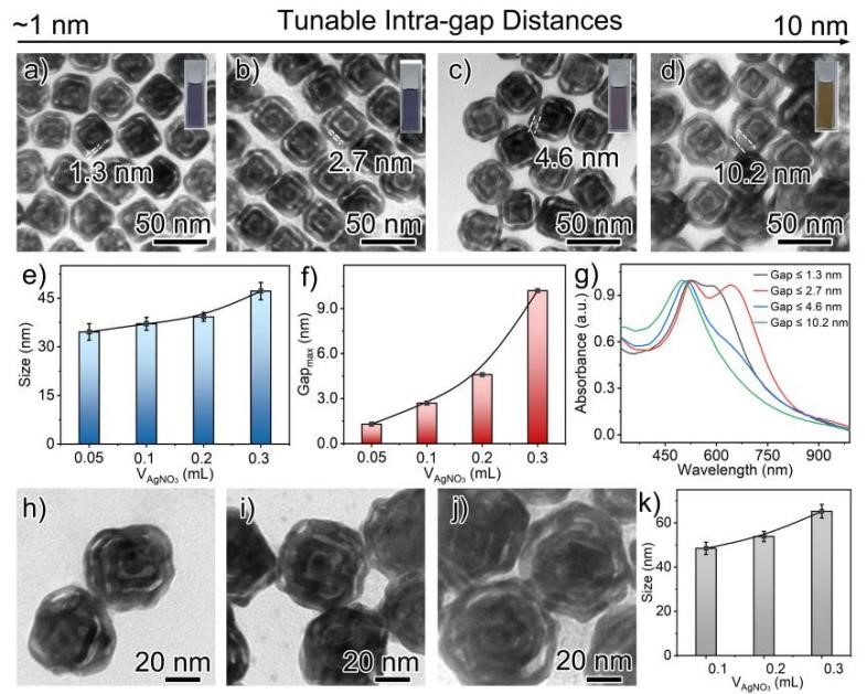 在此基础上,近日该团队采用电置换反应策略,以Au@Ag纳米立方体作为模板,Au、Pd、Pt等金属盐作为刻蚀剂,引入氯离子作为表面活性剂,精准控制刻蚀反应从{100}晶面开始;通过精准调控反应动力学,成功实现了对多层中空超结构成分、壳层数以及纳米间隙距离的精确控制。利用该策略,研究人员成功制备了具有3D空腔和清晰纳米间隙的单层、双层、三层半开放金属空心超结构。值得一提的是,通过控制模板的厚度以及金属盐前驱体的浓度,可对其形貌与间隙厚度进行调控,实现了1-10 nm层间间隙的纳米级精准调控。进一步控制金属盐前驱体的添加顺序与反应动力学参数,分步执行Ag壳层包覆与电置换反应,可对每层组分进行逐层设计,构建出一系列包含不同Au-Ag、Pt-Ag、Pd-Ag合金组合的双层和三层空心超结构库。不同金属组合可针对特定体系“量体裁衣”,这种“模块化”设计思路,为按需设计超结构材料提供了可能。