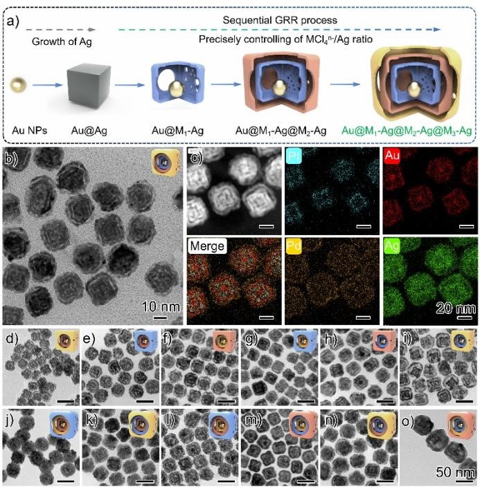 在微观世界的纳米尺度领域,多层中空超结构就像一座蕴含无限潜力的“宝藏”,在催化、生物传感、光学器件等领域展现出广阔的应用前景,正逐渐成为科研人员竞相探索的焦点。这种独特的结构由多个同心或偏心的金属壳层与内部空腔构成,就像微观世界里层层嵌套的精致的“纳米级俄罗斯套娃”。在纳米尺度下精确控制每一层的厚度、成分以及层间的间隙至关重要,任何微小的偏差都可能影响整个结构的性能。然而,构筑这类纳米级多层中空超结构面临着诸多难题与挑战。尤其是将多种金属集成在一个多层结构中,需同时解决热力学不稳定性、界面扩散控制及反应动力学匹配等难题。
