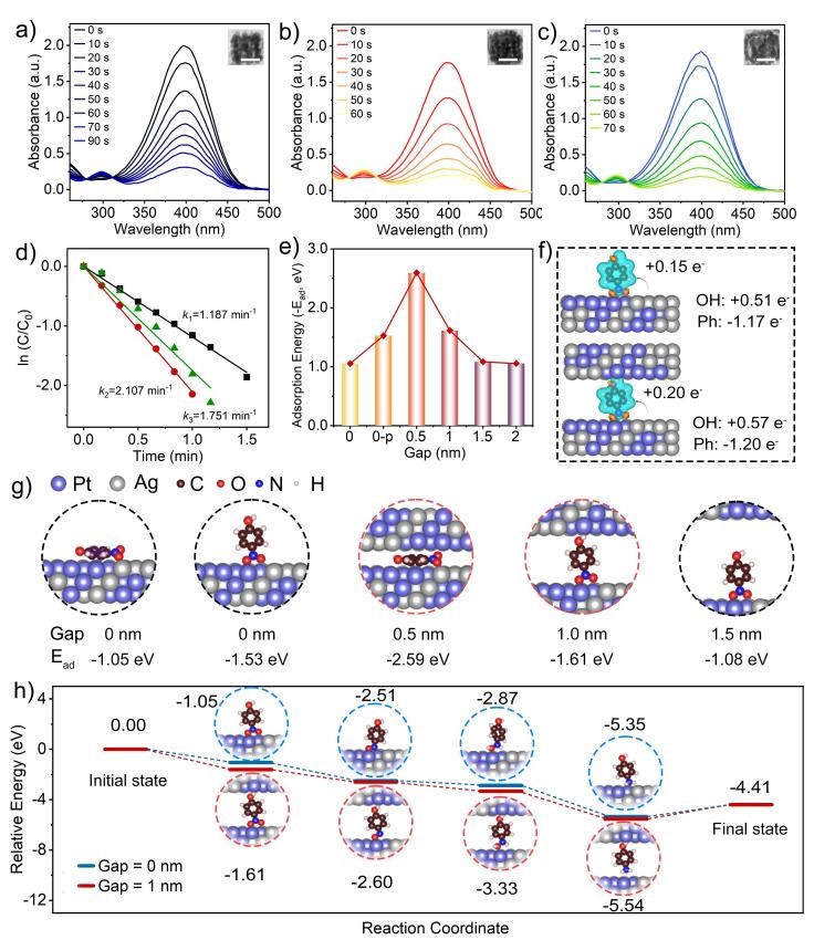 这种高精度的纳米材料制备技术为探究结构-性能之间的关系奠定了扎实的基础。在催化性能测试中,三层Au@Pt-Ag超结构在4-硝基苯酚还原反应中表现卓越,催化速率比商业Pt/C催化剂高出211.6倍。DFT模拟结果显示,纳米级间隙的尺寸与反应分子的大小匹配是关键。当间隙缩小至1纳米时,促使反应分子在纳米粒子间隙中的吸附能得到显著优化,且催化加氢反应能垒大幅降低,同时由于多层结构活性位点的提升,这种“纳米限域效应”使得多层中空纳米粒子展现出优异的催化性能。