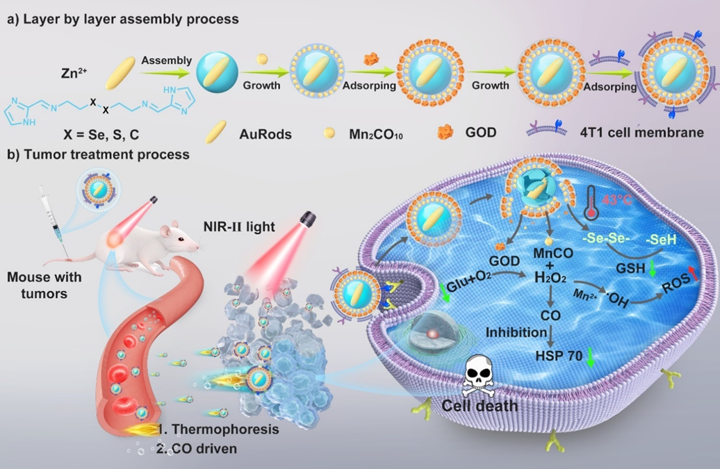 图 1. (a):通过层层组装制备双驱动纳米马达的分步示意图。(b):DSACGM NPs 在 NIR - II 和 CO 驱动下穿透肿瘤组织,实现多模式协同治疗(包括饥饿疗法、化学动力学疗法和温和光热疗法)的示意图。