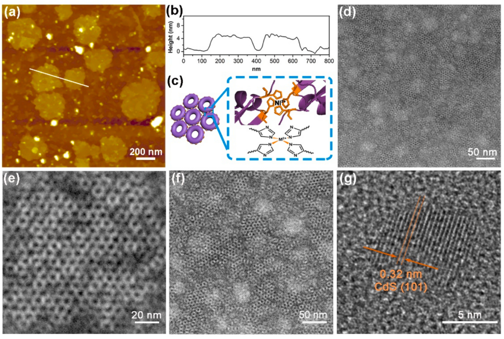 蛋白变体通过Ni2+螯合作用组装得到规则2D纳米片结构,为原位生长CdS QDs提供了规则的锚定位点(图3)。对该人工光催化系统进行性能测试,发现CdS@MBP-SP1-2His及其组装体的光催化产氢速率显著高于对照组,且产氢性能与Cd²⁺浓度有关。与游离CdS相比,其产氢速率大幅提高,组装体的性能更佳。此外,系统的稳定性研究表明,蛋白质及其组装行为对稳定无机催化剂和有序排列催化中心至关重要,组装体系统在长时间放置后仍能保持较高的催化活性,而游离CdS的催化性能下降明显。